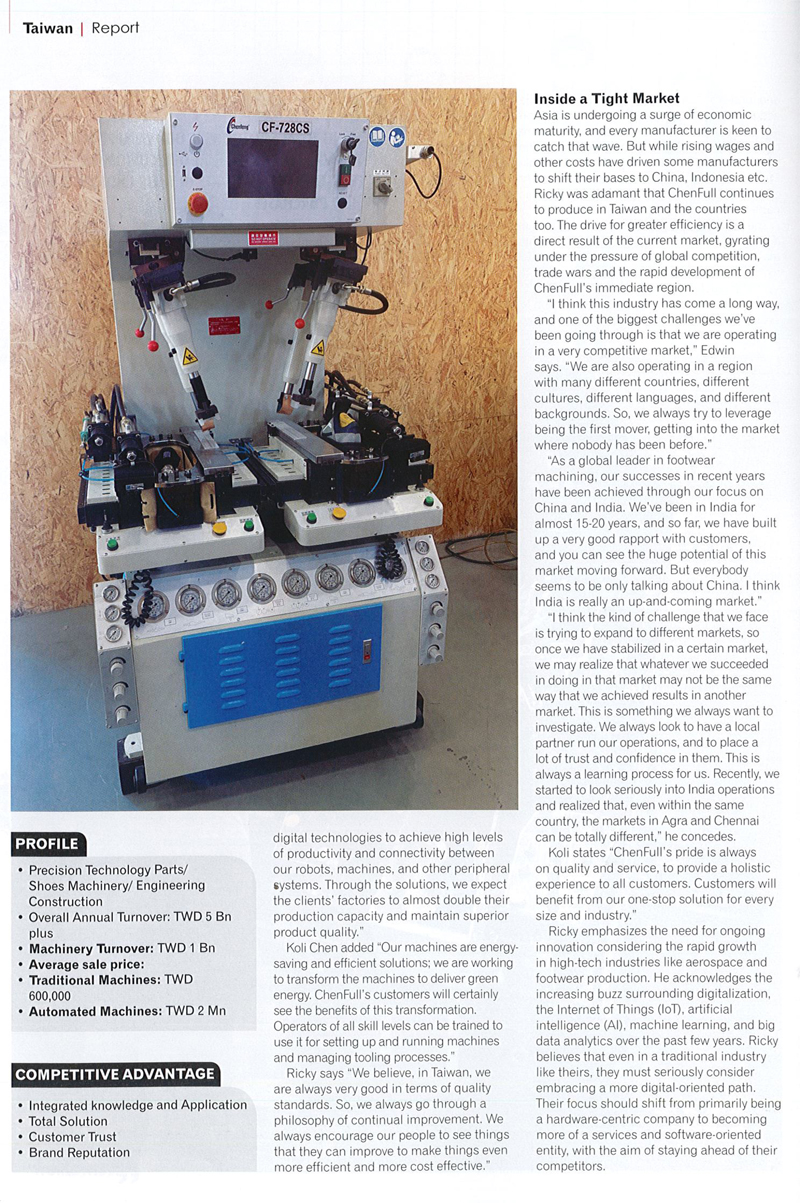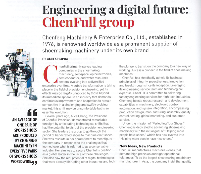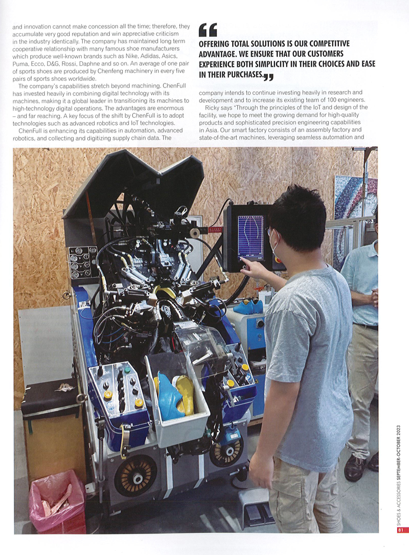 全鋒鞋機正投入大量資源將數位技術與機器結合,希望透過物聯網原理和機器設備的設計,並發展無縫自動化、智慧視覺辨識技術和物聯網技術等,不斷增強其在智能自動化技術以及供應鏈數位化方面的能力,滿足客戶對高品質產品和複雜精密工程能力的需求。