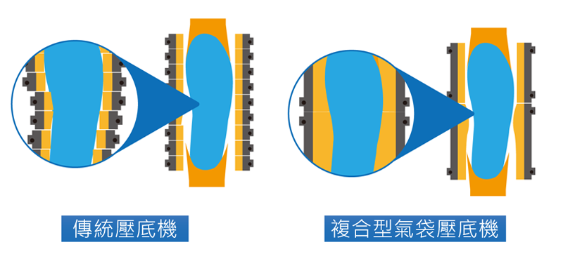 - 側壓塊採複合型氣袋設計,解決了單一氣囊壓底機可能導致的鞋面損傷問題。